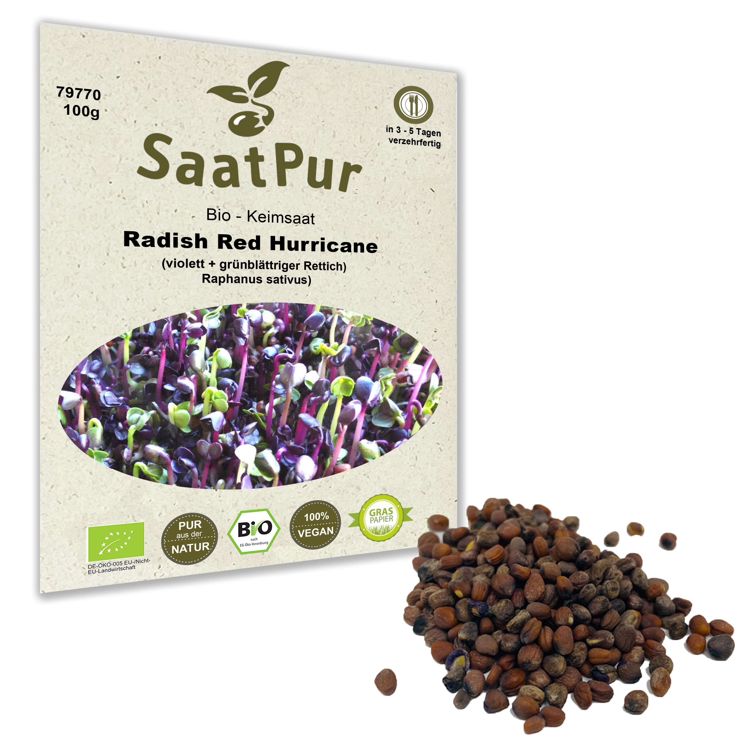 Red Hurricane-Sprossen zeichnen sich durch einen scharf-würzigen Geschmack aus. Hat sowohl grüne als auch violette Blätter und Wurzeln. Verwendung: als Brotbelag, in Dips, Frischkäse, Pfannengerichten, Salaten und Suppen. Die Sprossen können nach ca. 3 - 5 Tagen geerntet werden. Bei längerer Keimzeit werden die Sprossen milder.