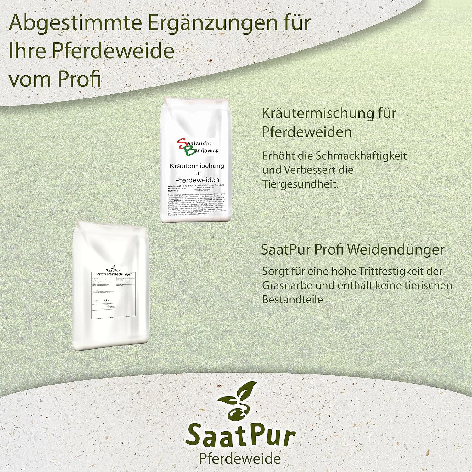Qualitäts-Mischung für stark beanspruchte Pferdweiden und Ausläufe. Saatzucht Bardowick Pferdeweide ist die Grundlage für saftig grüne Weiden mit gesundem Futter. Das ist auch dort möglich, wo die Grasnarbe durch scharfen Tritt und tiefen Verbiss der Pferde besonders strapaziert wird. In die Mischung fließt ein hoher Anteil an Rasengräsertypen, die einen niedrigen Blattansatz, intensive Bestockung und sehr gute Narbendichte aufweisen. Die Futtergräser in dieser Mischung sind auf die hohen Anforderungen der Pferde an schmackhaftes und gesundes Futter abgestimmt. Dazu gehört insbesondere das Lieschgras, denn es verbessert den Futterwert und wird sehr gern von Pferden gefressen. Der Frühjahrsaufwuchs liefert ein strukturreiches Futter, das auch siliert oder zur Heubereitung genutzt werden kann.