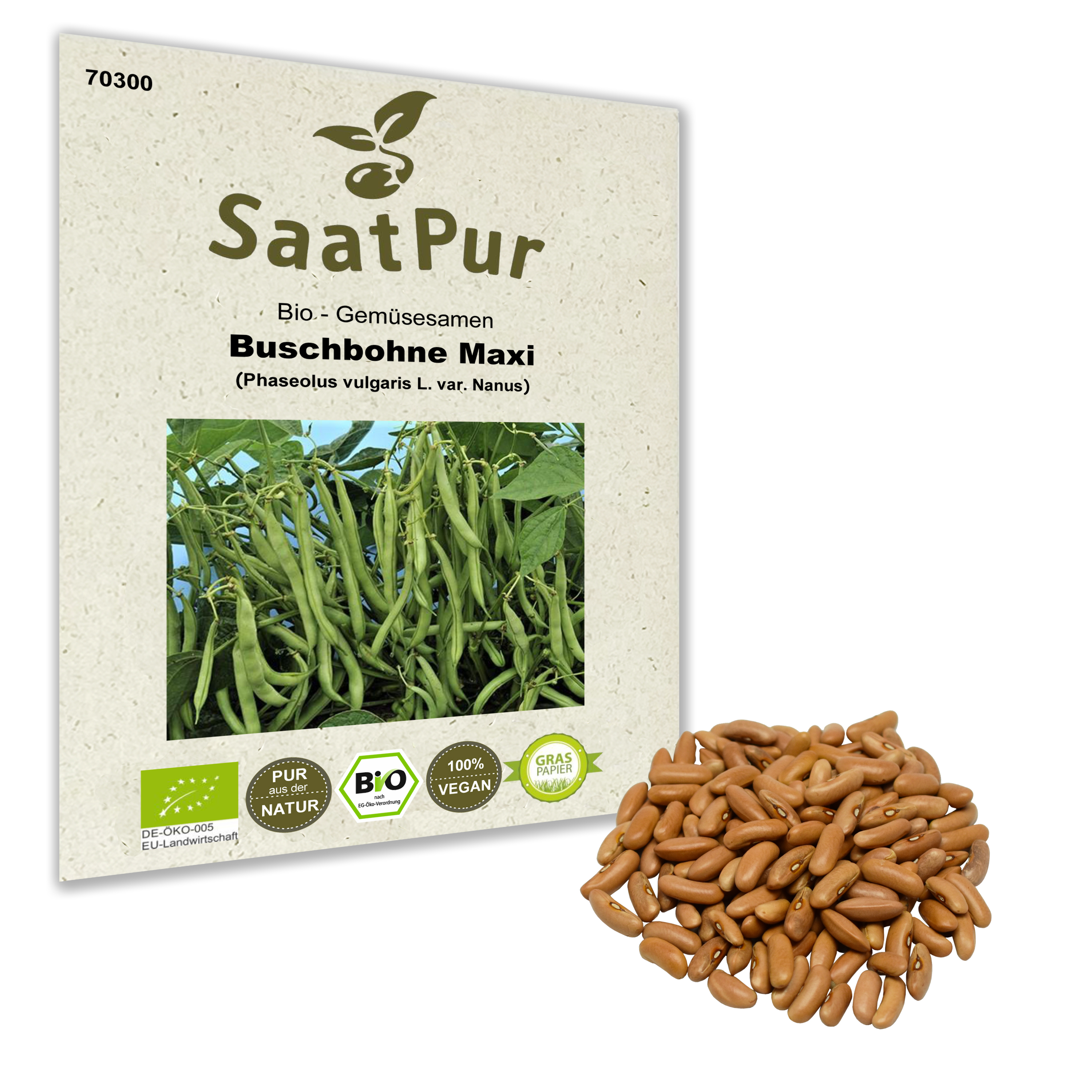 Buschbohne Maxi -Besonderer Bohnentyp mit über dem Laub hängenden, 18 – 20 cm langen, runden Hülsen (sogenannter Gluckentyp). Einfach zu pflücken. Die Hülsen sind fadenlos und bleiben lange zart. Maxi ist sehr früh und bringt hohe Erträge. Das Samenkorn ist hellbeige. Zum Einfrieren gut geeignet. Bewässerung nach der Blüte und während der Hülsenbildung. Bohnenhülsen und -kerne sind giftig und dürfen daher nicht roh verzehrt werden!