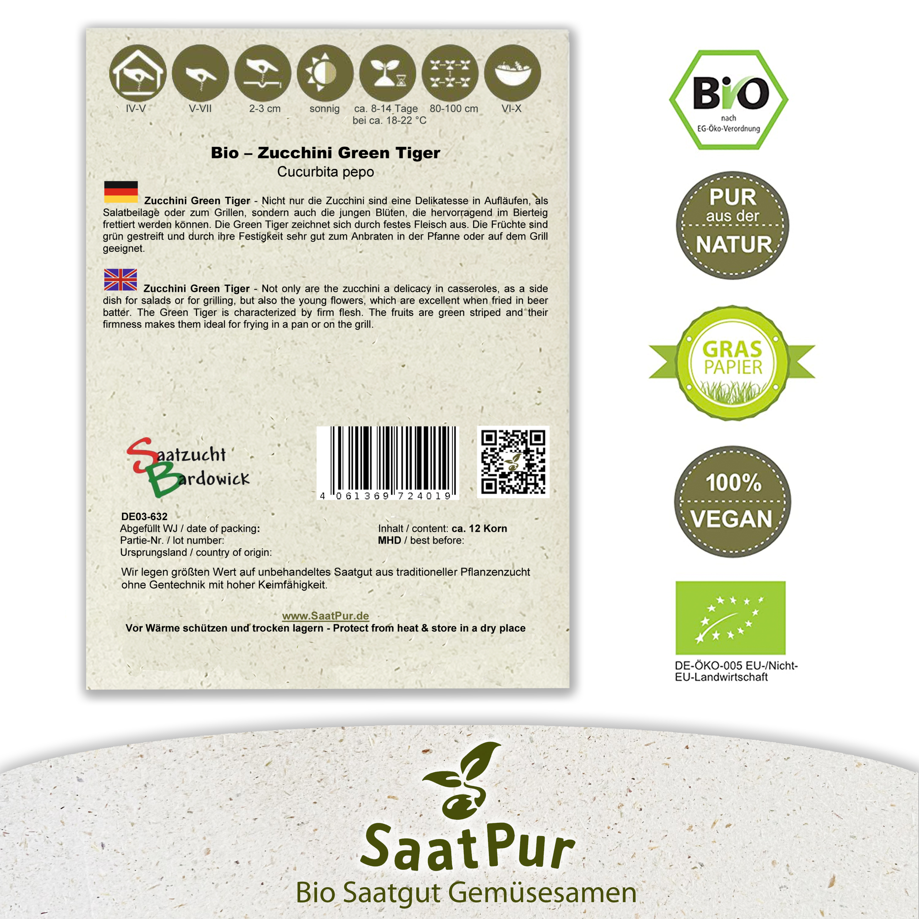 Bio – Gemüsesamen Zucchini Green Tiger - Cucurbita pepo Nicht nur die Zucchini sind eine Delikatesse in Aufläufen, als Salatbeilage oder zum Grillen, sondern auch die jungen Blüten, die hervorragend im Bierteig frettiert werden können. Die Green Tiger zeichnet sich durch festes Fleisch aus. Die Früchte sind grün gestreift und durch ihre Festigkeit sehr gut zum Anbraten in der Pfanne oder auf dem Grill geeignet.