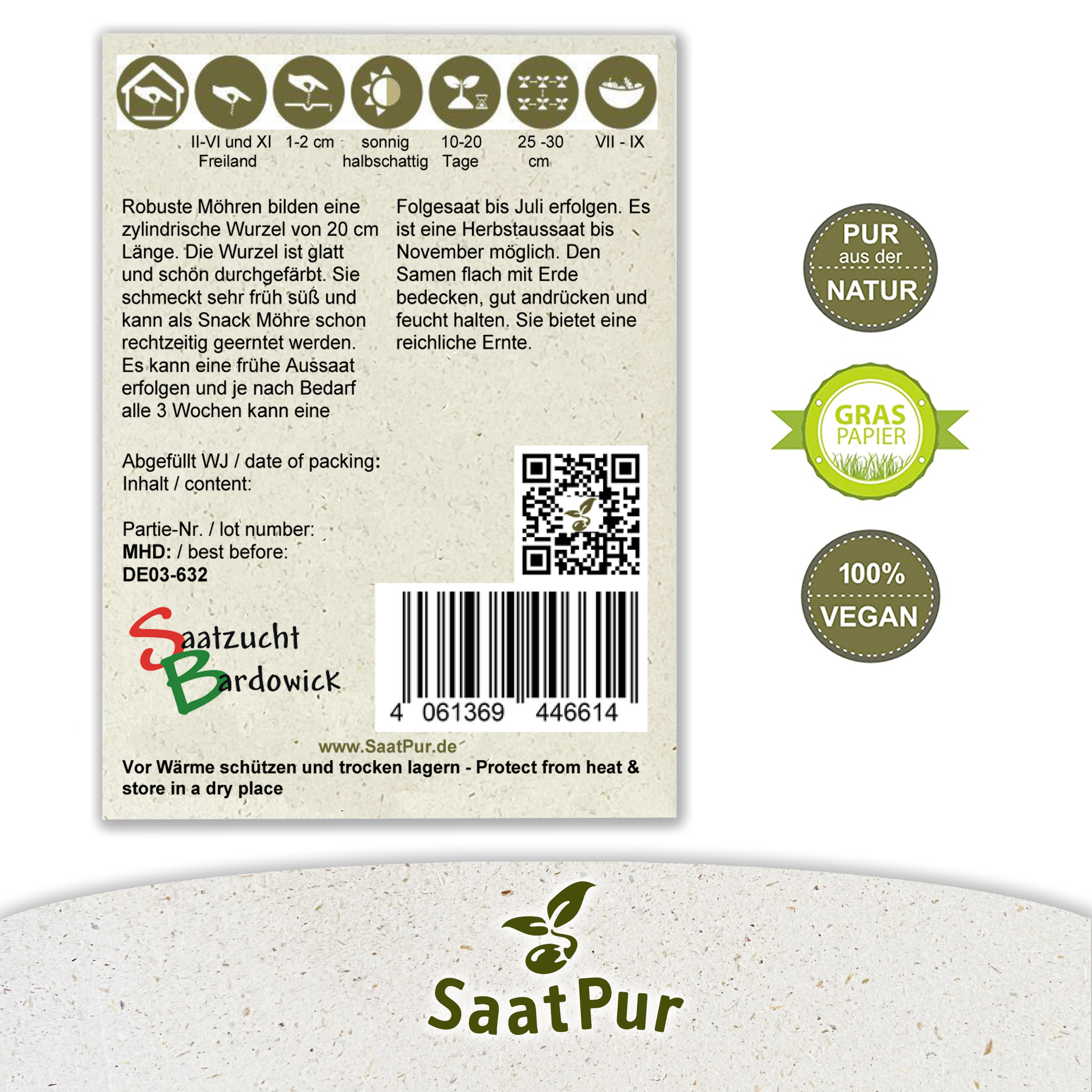 Robuste Möhren bilden eine zylindrische Wurzel von 20 cm Länge. Die Wurzel ist glatt und schön durchgefärbt. Sie schmeckt sehr früh süß und kann als Snack Möhre schon rechtzeitig geerntet werden. Es kann eine frühe Aussaat erfolgen und je nach Bedarf alle 3 Wochen kann eine Folgesaat bis Juli erfolgen. Es ist eine Herbstaussaat bis November möglich. Den Samen flach mit Erde bedecken, gut andrücken und feucht halten. Sie bietet eine reichliche Ernte.