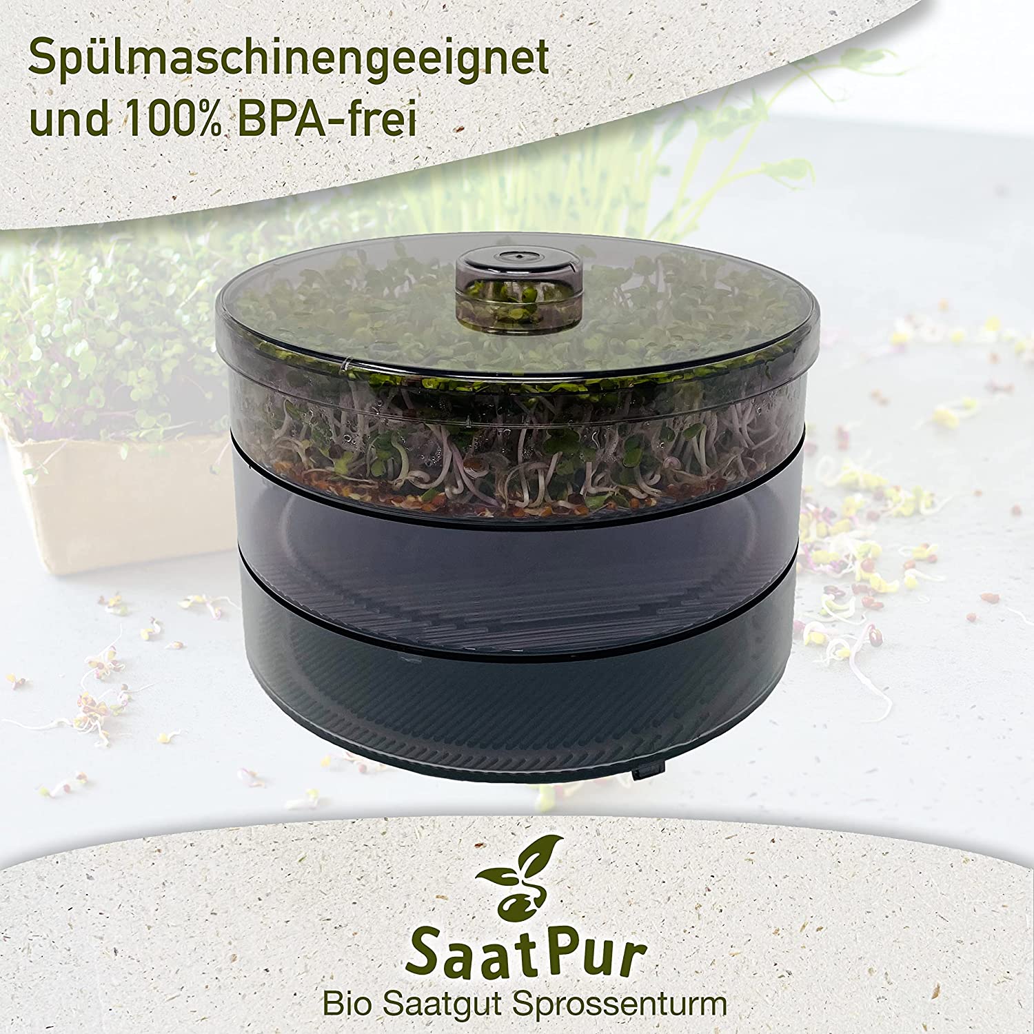 Mit unserem SaatPur Keimsprossenturm sind ihnen keine Grenzen gesetzt . Die leicht getönten Schalen aus robustem Kunststoff passt platzsparend nicht nur auf die Fensterbank. Sie ist spülmaschinenfest und somit einfach zu säubern.