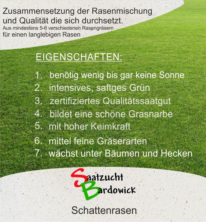 Eine feine strapazierfähige Mischung mit geprüften Rasengräsern. Gut geeignet für halbschattige bis schattige Rasenflächen.