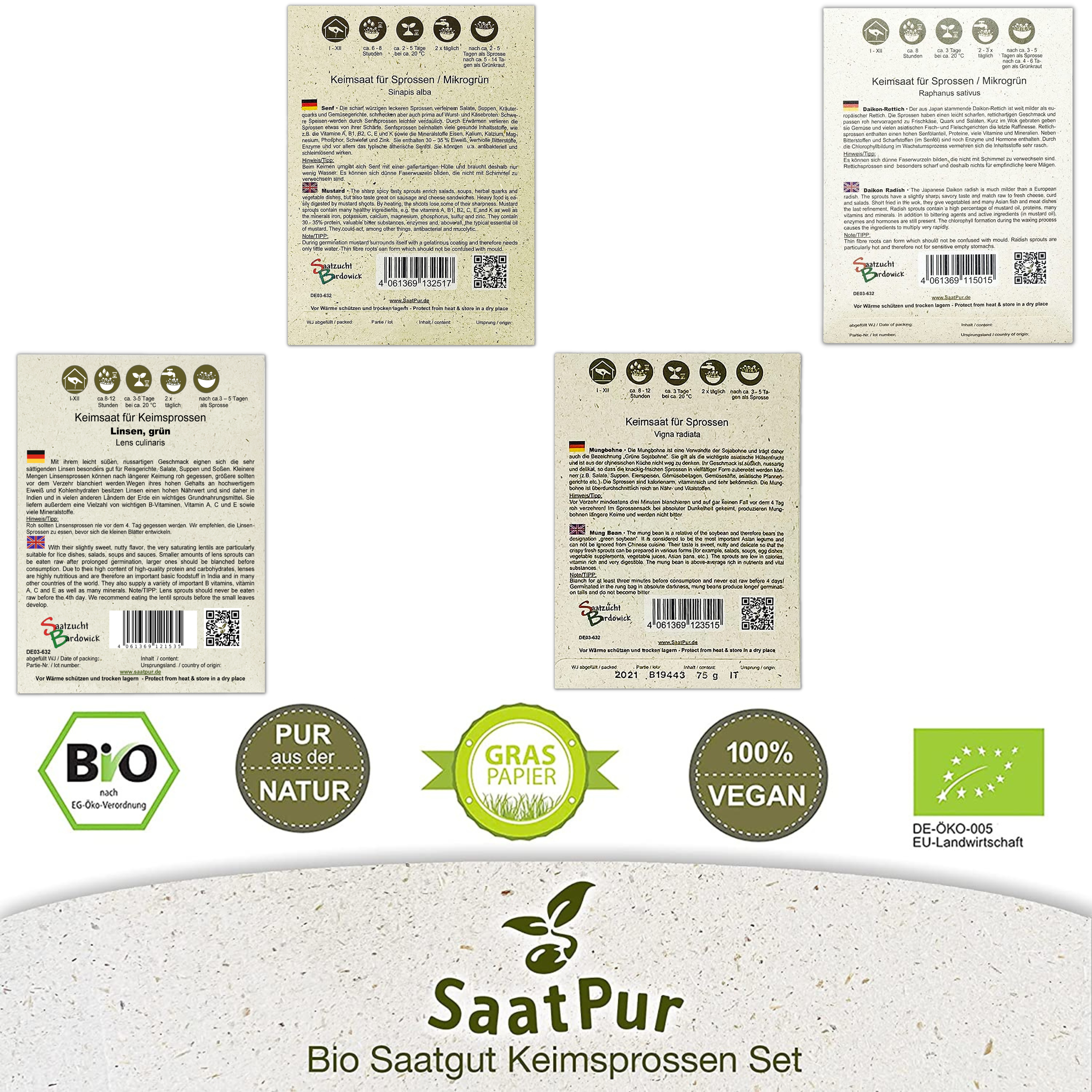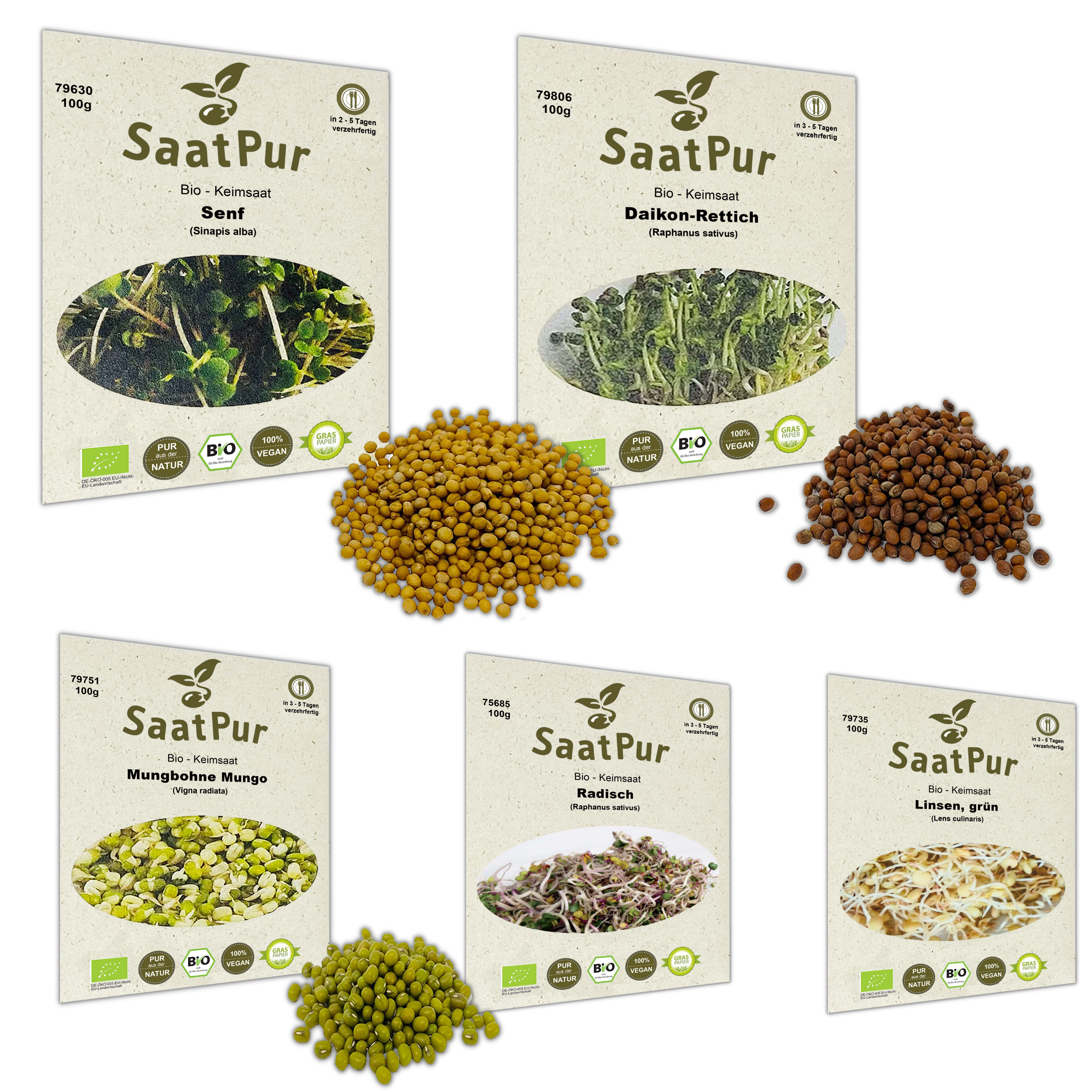 Produktinformationen "SaatPur BIO Keimsprossen Set 5 BIO Sorten Spicy Mix - Radies, Mungobohnen, Senf, Linsen Grün, Daikon"