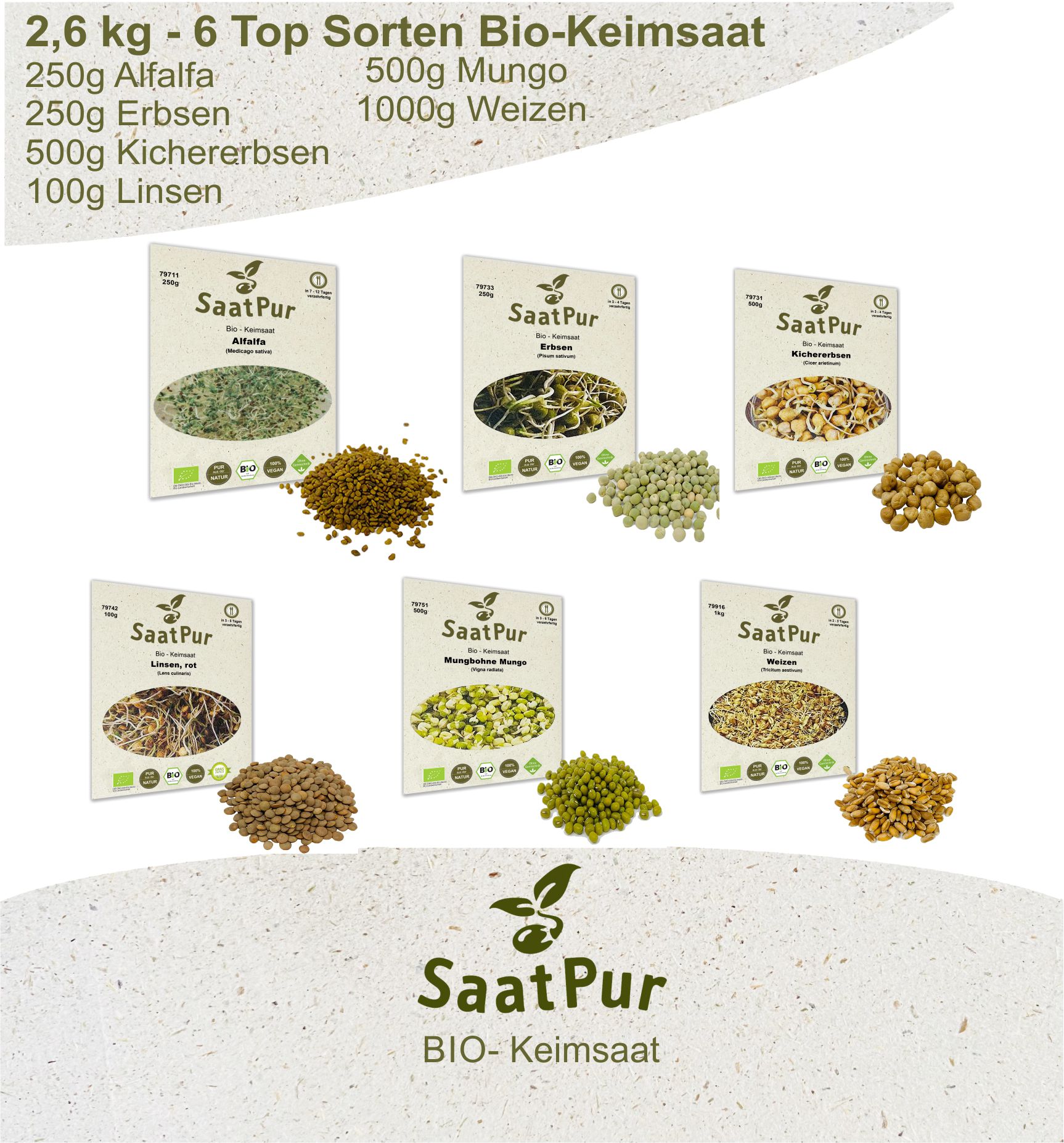 2,6 kg BIO-Keimsaat "6 Top Sorten " Keimsprossen Alfalfa Erbsen Kichererbsen Linsen Mungo Weizen