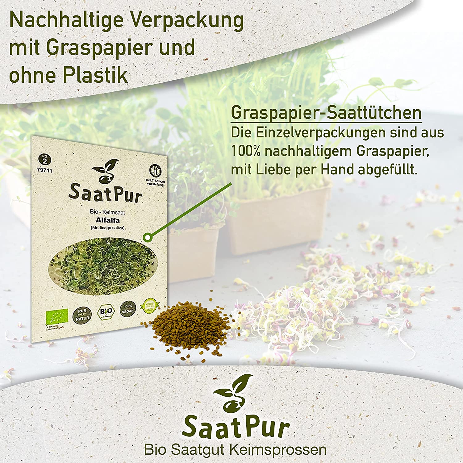 SaatPur® Bio Keimsprossen Geschenk-Set Nr. 7 mit Keimsprossenglas (500ml) und 5 Saattüten Keimsaat, hohe Keimkraft, Micro-Greens für vitaminreiche Ernährung, nachhaltige Graspapier-Verpackung, vegan   IDEALS GESCHENKSET: Dieses Set besteht aus 5 Portionen Bio Keimsprossen und einem 500ml Sprossenglas für optimale Anzucht. Mit dem Saatgut kannst du Microgreens und Sprossen für grüne Smoothis, zum Knabbern oder für Salate züchten, für eine gesunde, vitale, vegane und vitaminreiche Ernähung. Dieses 5er Geschenk-Set mit Sprossenglas beinhaltet 5 einzeln verpackte Saattüten. Jede davon enthält Hinweise, um das Säen und Anziehen zu erleichtern. HOHE KEIMKRAFT UND LEICHTE ANZUCHT: Unser Saatgut zeichnet sich durch hohe Keimkraft aus und ist damit auch besonders für Anfänger geeignet. Auf jeder Saattüte finden Sie die Anleitung, wie Sie die Sprossen am besten ziehen. Folgende Sorten sind enthalten: 50g Alfalfa, 20g Rotkohl, 75g Lunja, 60g Emmer, 30g Radis Rambo SPROSSEN UND MICROGREEN: Aus der Saat entstehen nach einigen Tagen die ersten Sprossen. Die genaue Zeitangabe steht oben rechts auf der Rückseite der Tüte. Sobald sich darauf an den Sprossen erste Blätter bilden spricht man vom Microgreen oder zu deutsch Grünkraut oder Mikrogrün. Nicht jede Saat bildet Blätter aus. Genaue Informationen finden sich auf der Rückseite der Tüte. MADE IN GERMANY: Wir sind ein deutsches Unternehmen. Unsere BIO-Sprossen werden unter hohen Qualitätsansprüchen in Deutschland qualitätsgeprüft und von Hand abgefüllt. NACHHALTIG VERPACKT: Unser Saattütchen sind in 100% nachhaltiger Graspapierverpackung verpackt. Die Set-Verpackung ist aus recyceltem Karton besonders platzsparend und mit Verzicht auf unnötiges Füllmaterial. Dieses Set besteht aus 5 Portionen Bio Keimsprossen und einem 500ml Sprossenglas für optimale Anzucht. Mit dem Saatgut kannst du Microgreens und Sprossen für grüne Smoothis, zum Knabbern oder für Salate züchten, für eine gesunde, vitale, vegane und vitaminreiche Ernähung. Dieses 5er Geschenk-Set mit Sprossenglas beinhaltet 5 einzeln verpackte Saattüten. Jede davon enthält Hinweise, um das Säen und Anziehen zu erleichtern. Unser Saatgut zeichnet sich durch hohe Keimkraft aus und ist damit auch besonders für Anfänger geeignet. Auf jeder Saattüte finden Sie die Anleitung, wie Sie die Sprossen am besten ziehen. Aus der Saat entstehen nach einigen Tagen die ersten Sprossen. Die genaue Zeitangabe steht oben rechts auf der Rückseite der Tüte. Sobald sich darauf an den Sprossen erste Blätter bilden spricht man vom Microgreen oder zu deutsch Grünkraut oder Mikrogrün. Nicht jede Saat bildet Blätter aus. Genaue Informationen finden sich auf der Rückseite der Tüte. Wir sind ein deutsches Unternehmen. Unsere BIO-Sprossen werden unter hohen Qualitätsansprüchen in Deutschland qualitätsgeprüft und von Hand abgefüllt. Unser Saattütchen sind in 100% nachhaltiger Graspapierverpackung verpackt. Die Set-Verpackung ist aus recyceltem Karton besonders platzsparend und mit Verzicht auf unnötiges Füllmaterial. Übersicht aller enthaltenen Sorten:  - Alfalfa 50g - Rotkohl 20g - Lunja 75g - Emmer 60g - Radies Rambo 30g