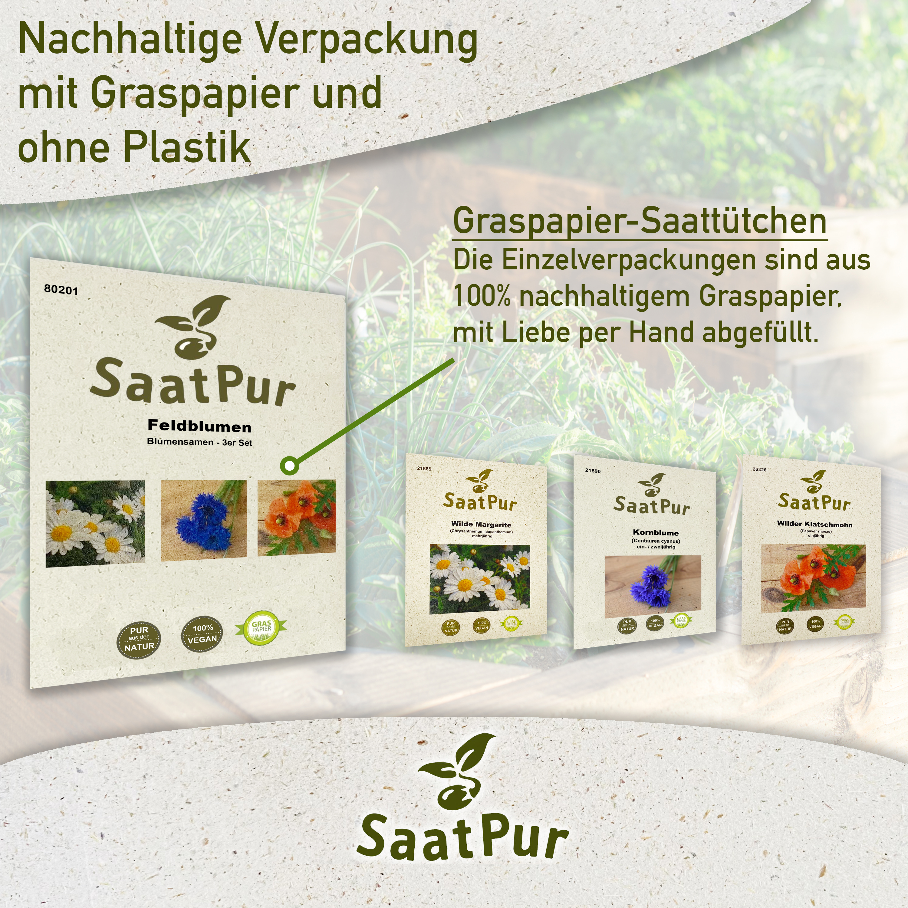 Nachhaltigkeit liegt uns am Herzen: Unsere Saattüten sind aus 100% nachhaltigem Graspapier verpackt, das umweltfreundlich und biologisch abbaubar ist. Die Set-Verpackung besteht aus recyceltem Karton und wurde platzsparend gestaltet, ohne unnötiges Füllmaterial. So kannst du nicht nur deine Blumenvielfalt genießen, sondern auch einen Beitrag zum Schutz unserer Umwelt leisten.
