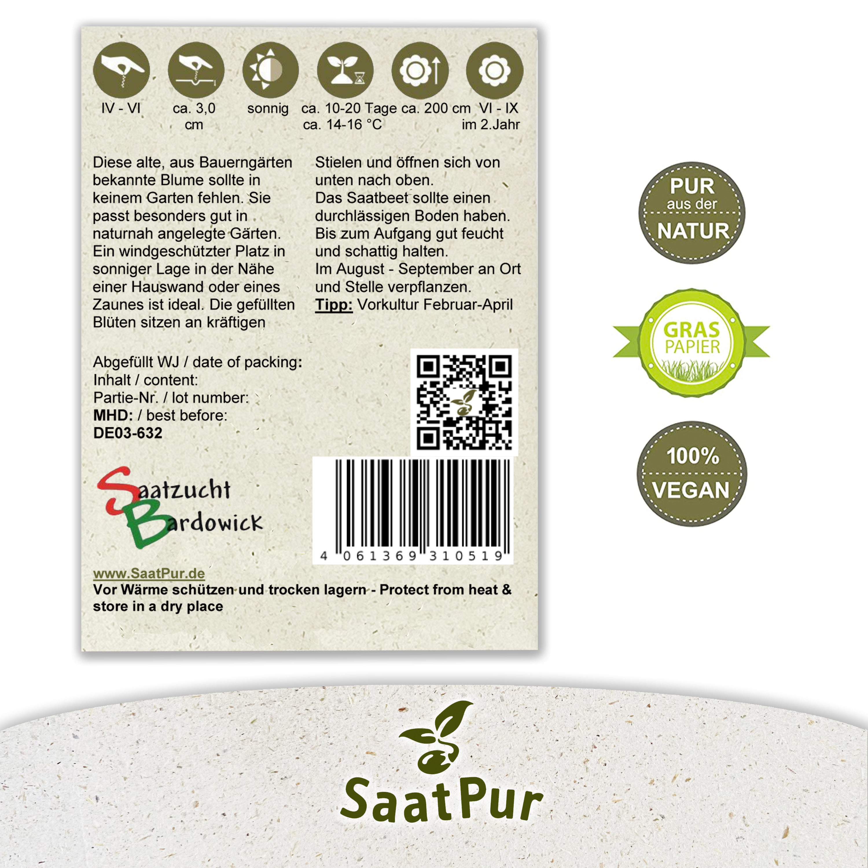 Diese alte, aus Bauerngärten bekannte Blume sollte in keinem Garten fehlen. Sie passt besonders gut in naturnah angelegte Gärten. Ein windgeschützter Platz in sonniger Lage in der Nähe einer Hauswand oder eines Zaunes ist ideal. Die gefüllten Blüten sitzen an kräftigen Stielen und öffnen sich von unten nach oben.
