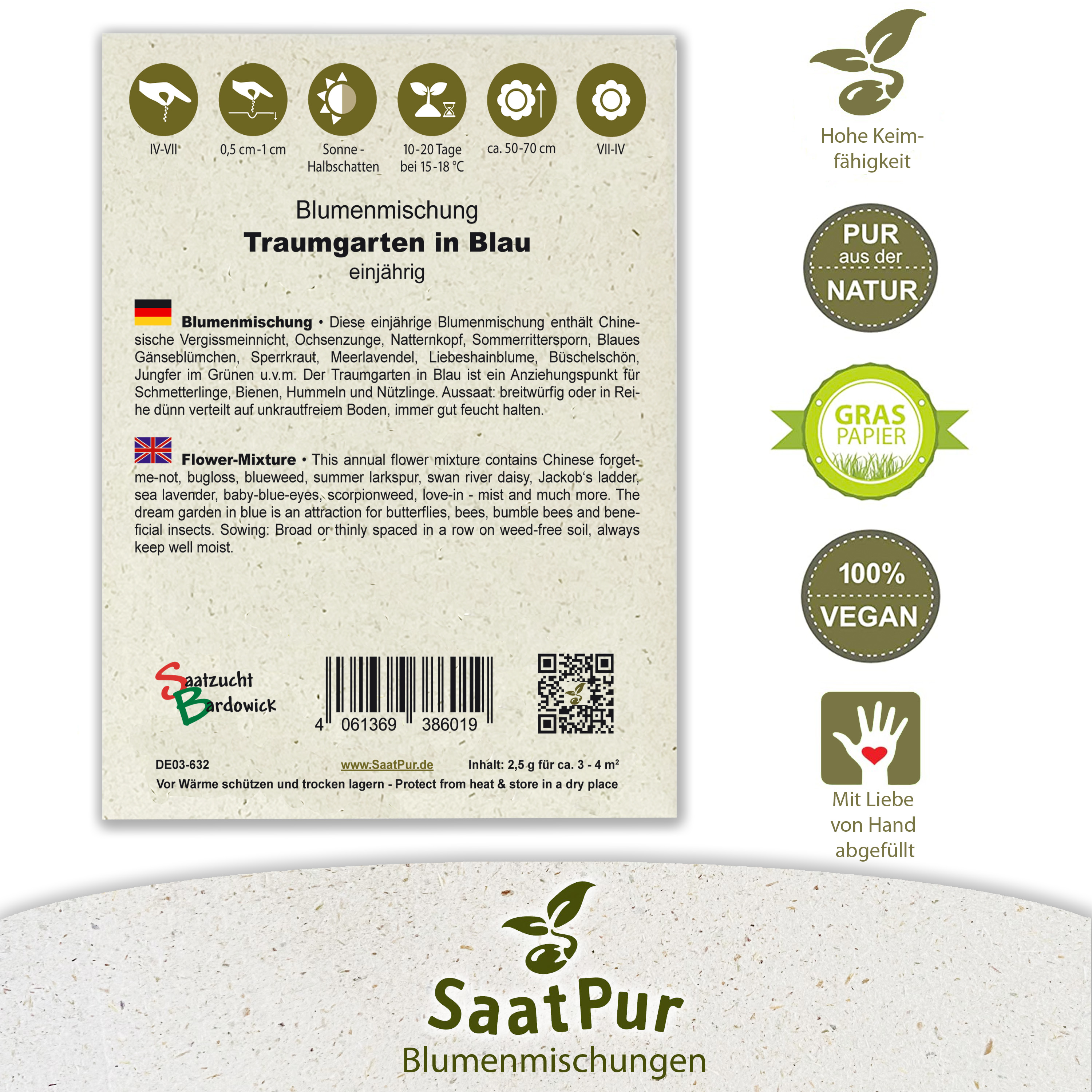 Inhalt: 1 Portion Saatgut reicht für ca. 3 – 4 m²