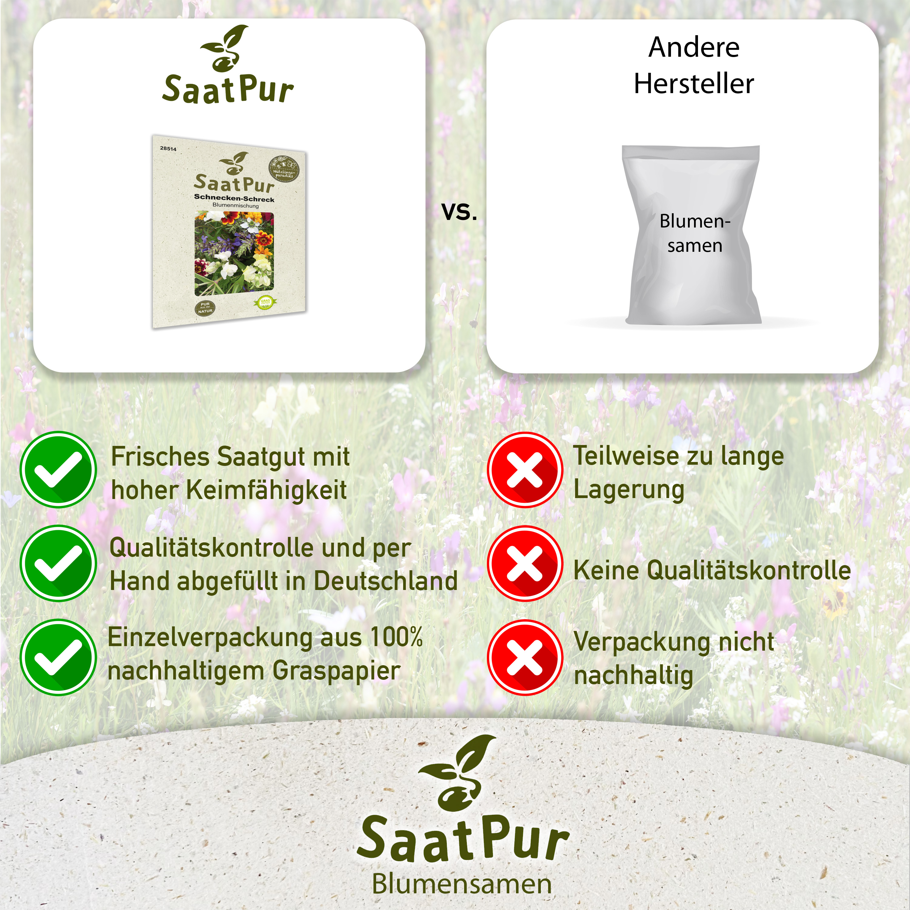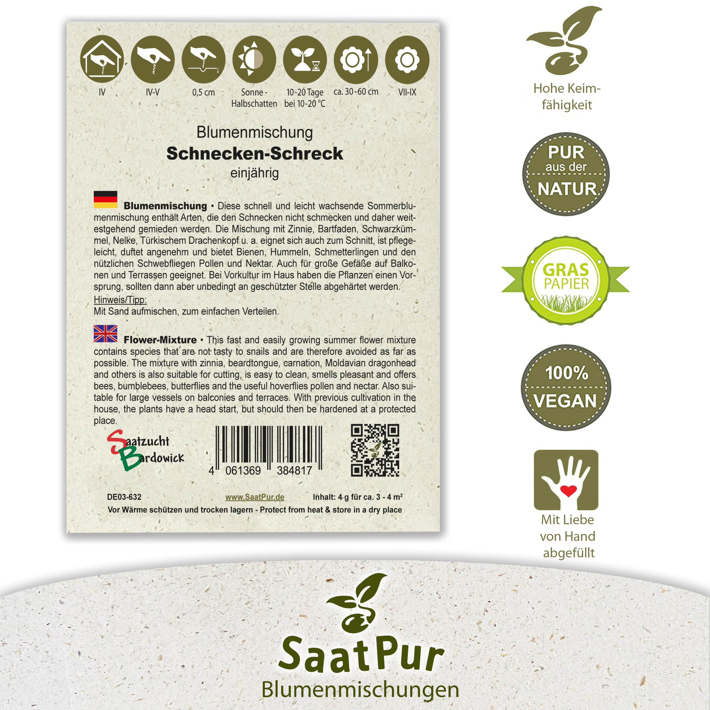 Diese schnell und leicht wachsende Sommerblumenmischung enthält Arten, die den Schnecken nicht schmecken und daher weitestgehend gemieden werden. Die Mischung eignet sich auch zum Schnitt, ist pflegeleicht, duftet angenehm und bietet Bienen, Hummeln, Schmetterlingen und den nützlichen Schwebfliegen Pollen und Nektar. Auch für die Anzucht in großen Gefäßen auf Balkonen und Terrassen geeignet. Bei Vorkultur im Haus haben die Pflanzen einen Vorsprung, sollten dann aber unbedingt an geschützter Stelle abgehärtet werden.