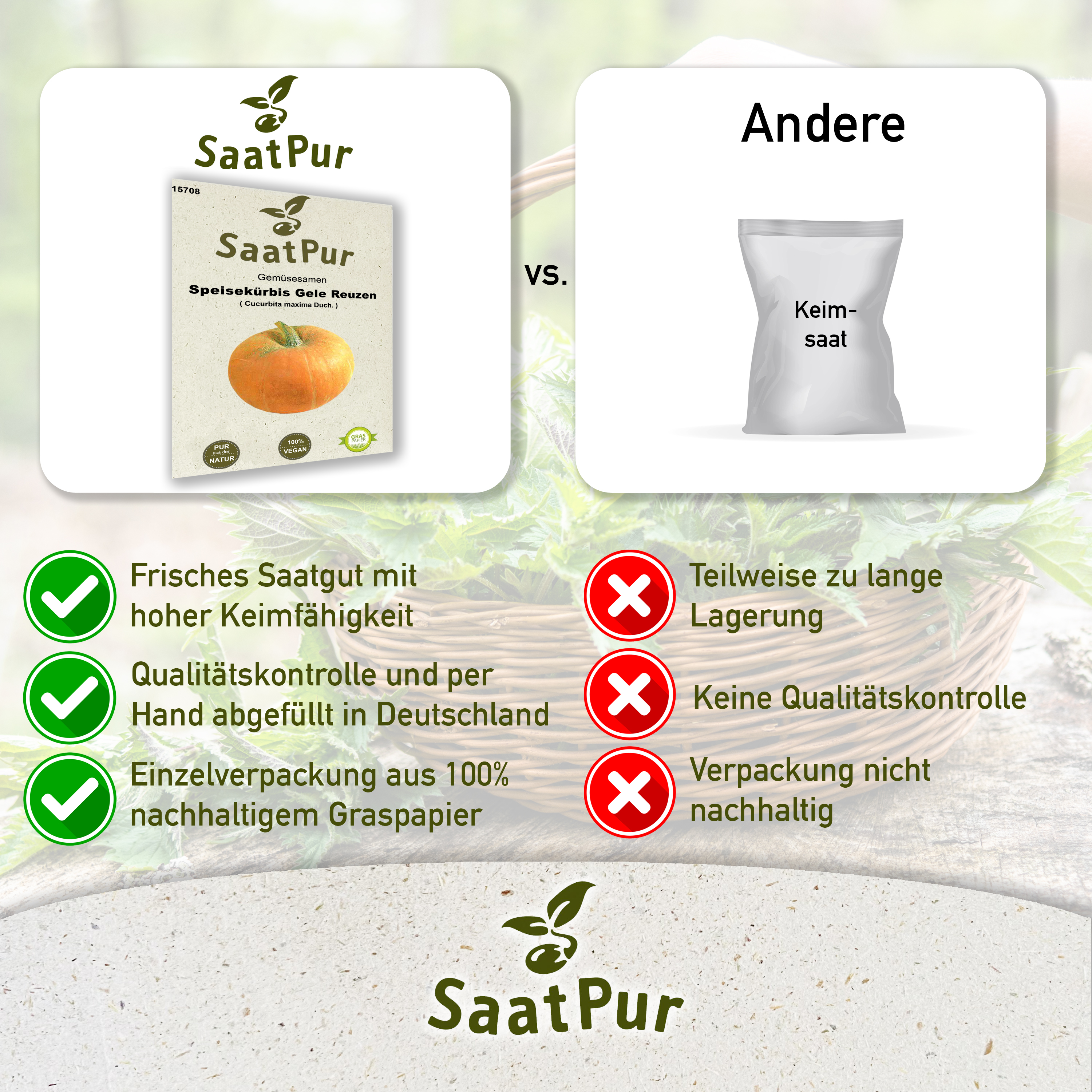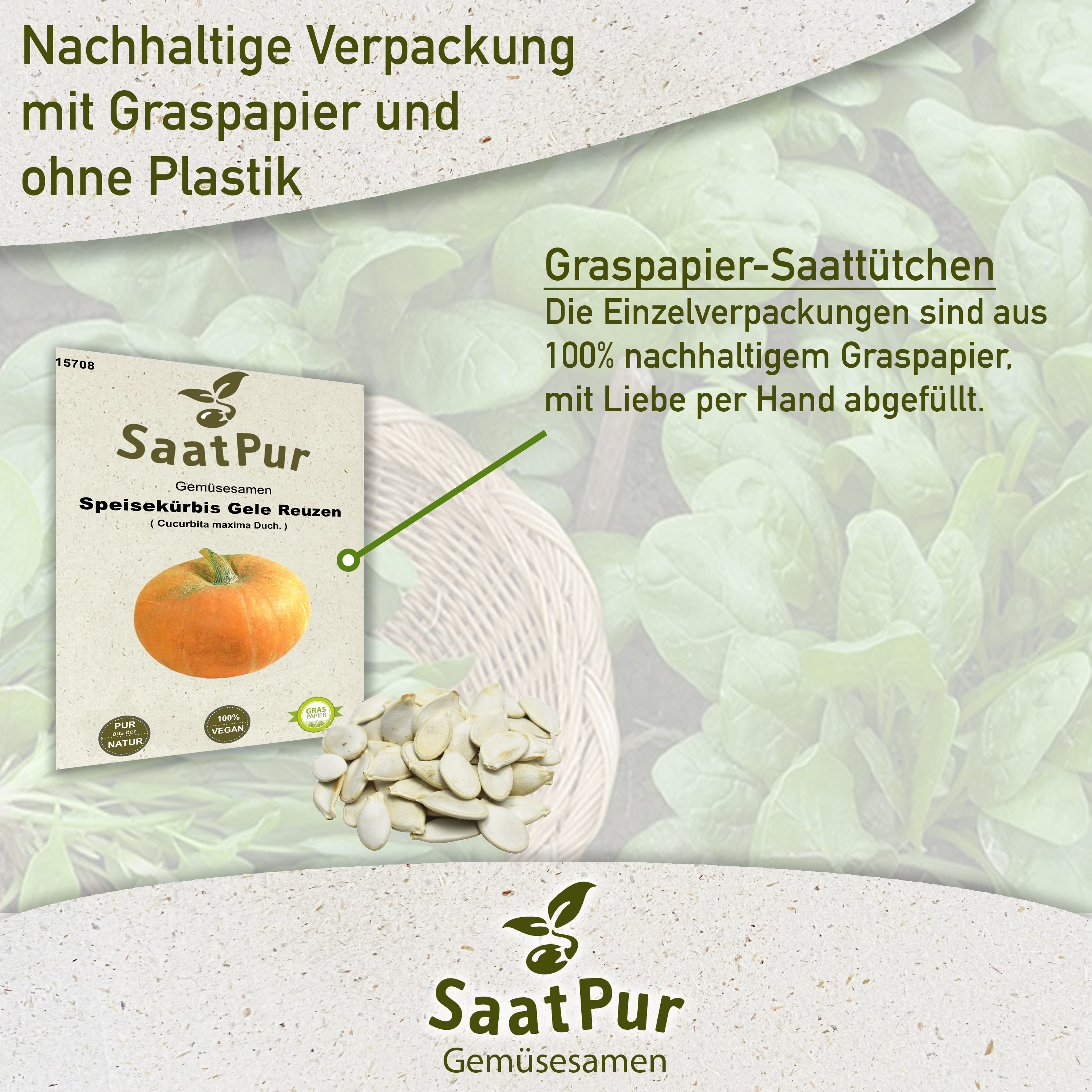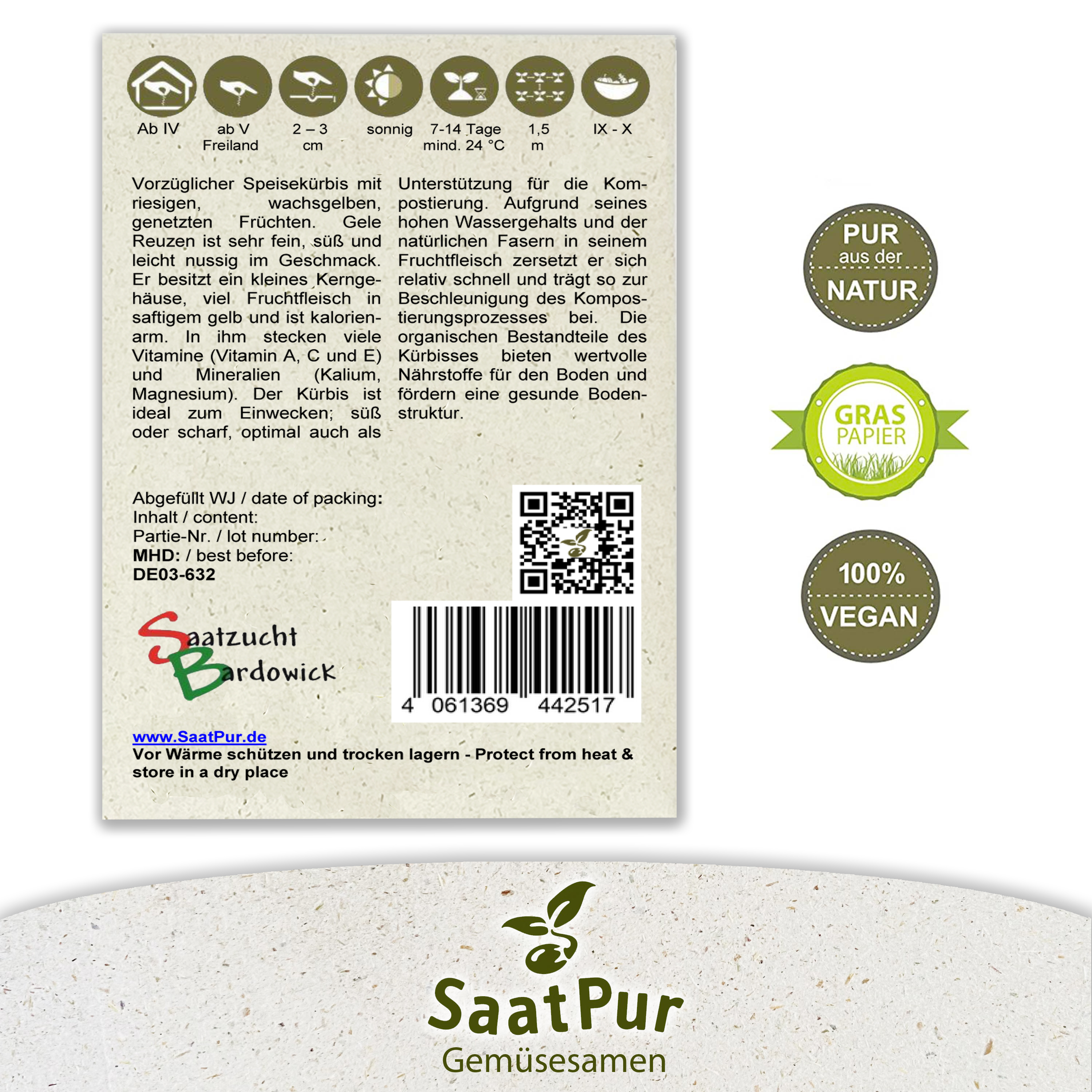 Cucurbita maxima Duchesne, umgangssprachlich als Speisekürbis Gele Reuzen oder auch Riesenmelonen oder gelber Zentner bekannt, ist eine vielseitige und nährstoffreiche Pflanze. Physisch zeichnet sich der Kürbis durch seine beeindruckende Größe aus, wobei er beachtliche Dimensionen erreichen kann. Die Schale variiert zwischen einem intensiven gelben und orangen Farbton und kann eine glatte oder leicht gerippte Struktur aufweisen.