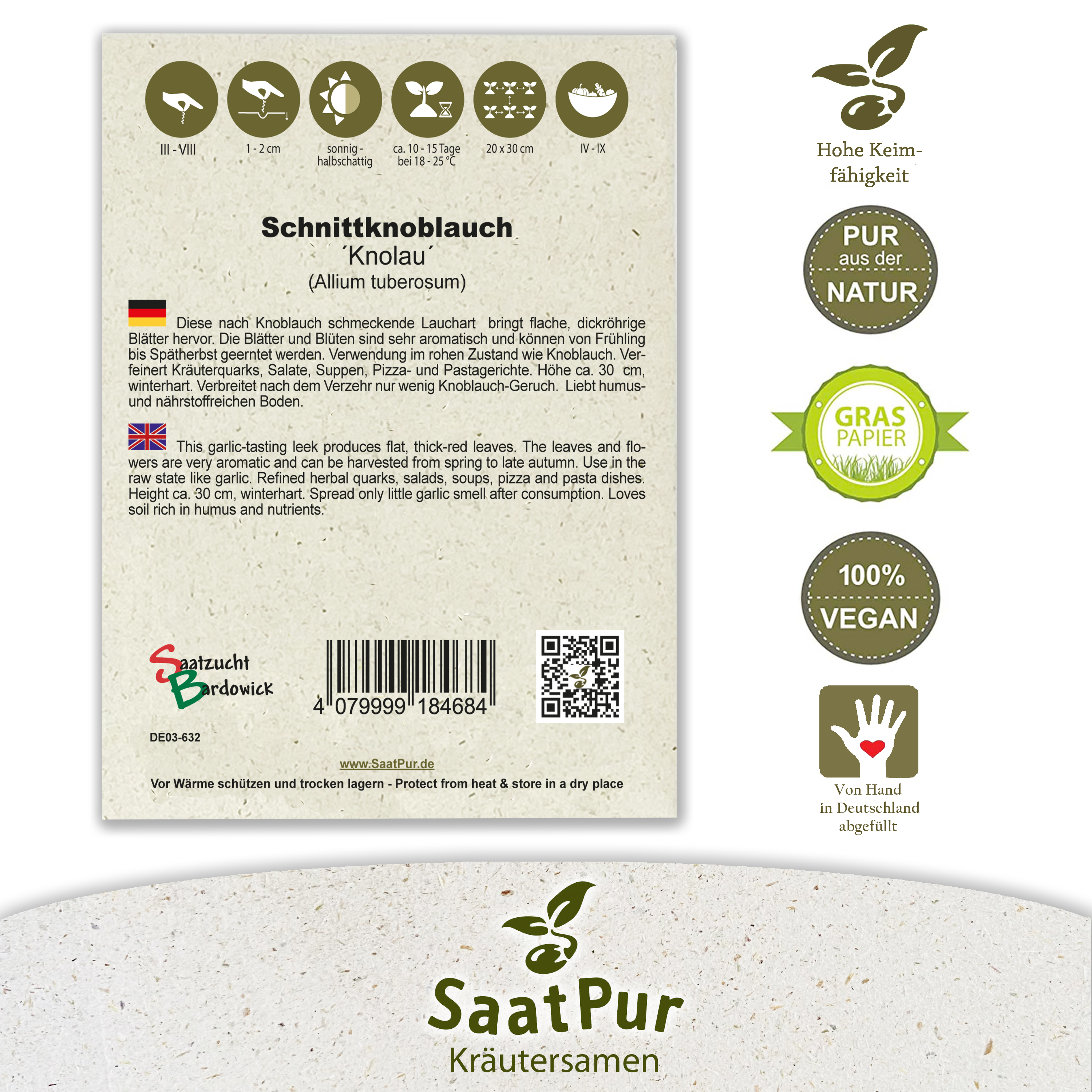 Diese nach Knoblauch schmeckende Lauchart bringt flache, dickröhrige Blätter hervor. Die Blätter und Blüten sind sehr aromatisch und können von Frühling bis Spätherbst geerntet werden. Verwendung im rohen Zustand wie Knoblauch. Verfeinert Kräuterquarks, Salate, Suppen, Pizza- und Pastagerichte. Höhe ca. 30 cm, winterhart. Verbreitet nach dem Verzehr nur wenig Knoblauch-Geruch. Liebt humus- und nährstoffreichen Boden.