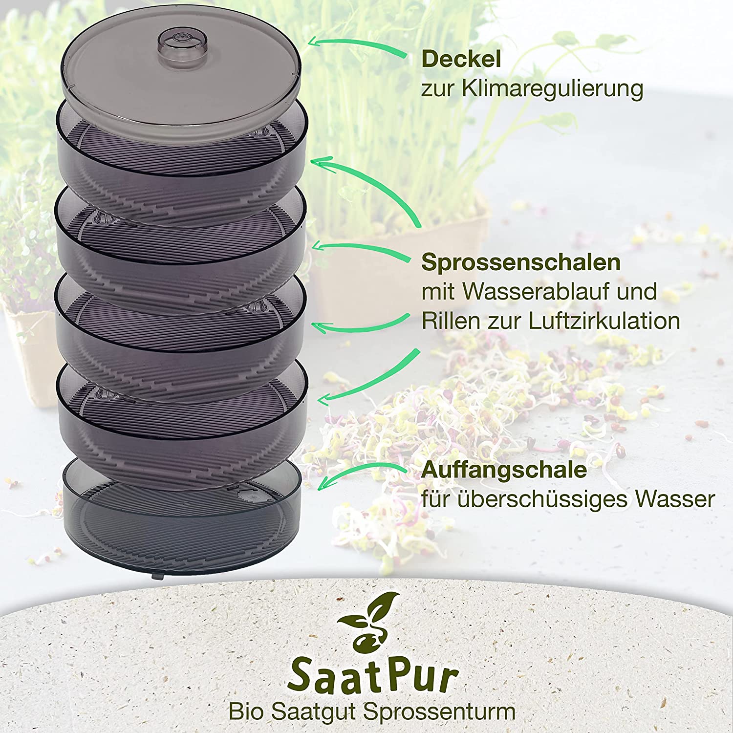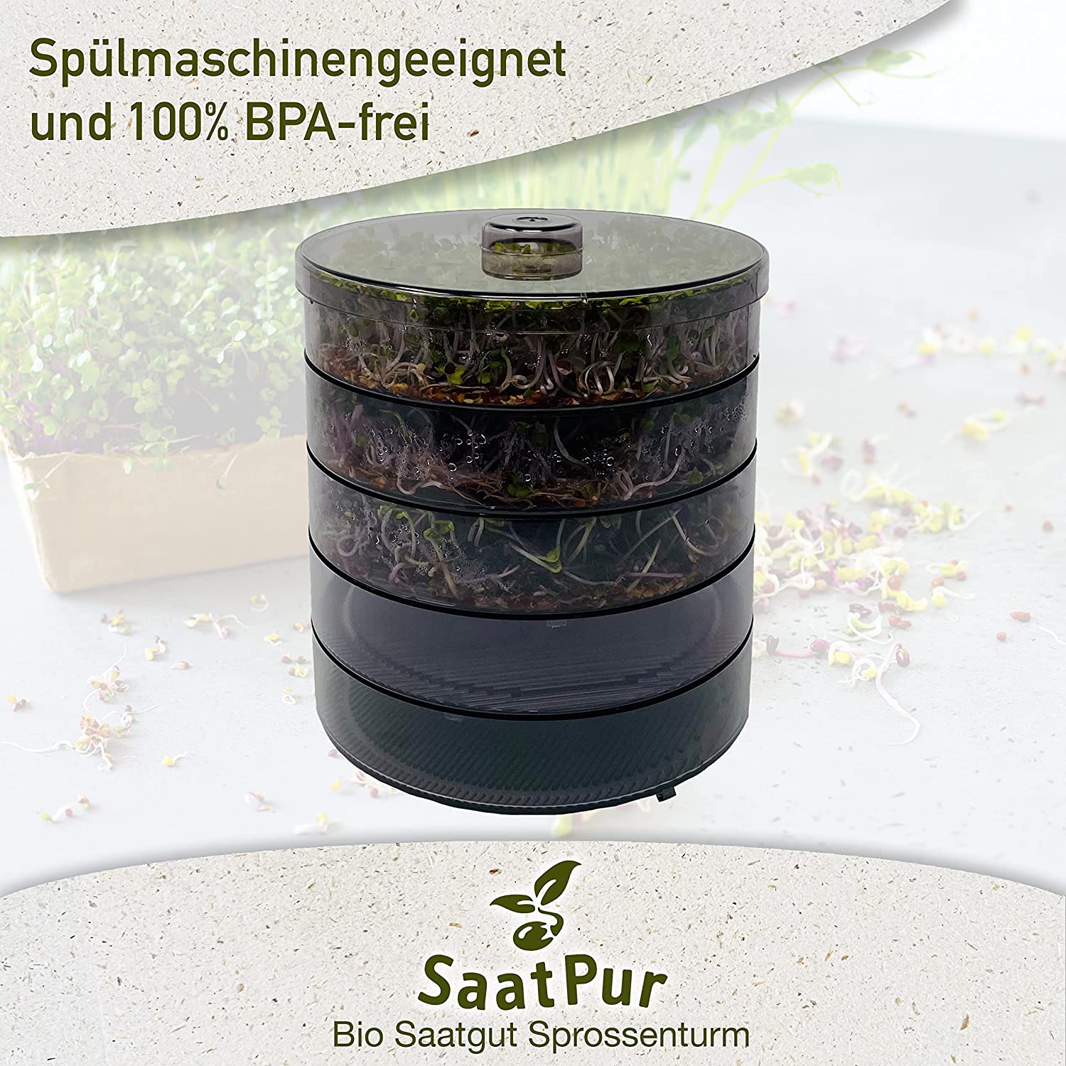 SaatPur Sprossenbox Set Nr 4 - mega -      bestehend aus :             -1xDeckel -          -4x Keimschale -          -1 x Wasserauffangschale Für Anfänger in der Sprossenanzucht sehr geeignet. Der Turm kann jederzeit erweitert werden um noch mehr verschieden Sprossen sich in der eigenen Küche herzustellen zu können und das nicht nur in der Winterzeit. Bio-Keimsprossen sind nicht nur bei Vegetarier, Veganer, etc. beliebt. Viele Menschen haben heutzutage keinen Garten und wollen denn noch ihren Körper mit Mineralstoffen, Enzymen, Spurenelementen und Vitaminen vollwertig ernähren. Kostengünstig, wertvolle, vitaminreiche Ernährung die in kürzester Zeit von eigener Hand zur Verfügung steht. Mit unserem SaatPur Keimsprossenturm sind ihnen keine Grenzen gesetzt . Die leicht getönten Schalen aus robustem Kunststoff passt platzsparend nicht nur auf die Fensterbank. Sie ist spülmaschinenfest und somit einfach zu säubern.  - kompakt  -  platzsparend - dekorativ - obtimale Bewässerung in der Sprossenschale - Deckel, Sprossenschale und Wasserauffangschale spülmaschienen geeingnet - einfach zu säubern - Bio-Keimsprossen und Microgreens schnell und einfach ohne Erde züchten - Farbe: getönt ( kann leicht von Bildschirmfarbe abweichen ) - Durchmesser: ca: 18,5 cm Knackig frische Keimsprossen – schnell und einfach selber ziehen Mit SAATPUR's Keimgarten lassen sich frische Keimsprossen schnell und einfach in der Wohnung ziehen.Bio-Keimsprossen sind reich an Vitaminen, Mineralien und Ballaststoffen. Sie gedeihen kinderleicht, sind pflegeleichtund wachsen das ganze Jahr über. Sie sind ein schmackhaftes, äußerst gesundes Frischgemüse für den Winter, dasjeder selbst in der Wohnung ziehen kann. Unser reichhaltiges Sortiment bietet für jeden Geschmack das Richtige!So einfach geht’s: Ca. 1 ½ Esslöffel Saatgut im Sieb unter fließendem Wasser abspülen, je nach Sprossenart vorweichen und erneutabspülen. Samen gleichmäßig in der Keimschale verteilen und an einem hellen Ort ohne direkte Sonneneinstrahlungstellen (z.B. Fensterbank). Die Sprossen zweimal täglich spülen dazu einfach Wasser von oben in die Keimschalegeben. Das Wasser läuft ab und sammelt sich in der darunterliegenden Auffangschale; diese nach dem Spülvorgangleeren. Die Keimsprossen sind nach ca. 2-8 Tagen fertig.Die frischen Sprossen lassen sich je nach Art im Kühlschrank mehrere Tage lagern.Hinweis: Feine Faserwurzeln an manchen Sprossen sind nicht mit Schimmel zu verwechseln. Eigenschaften des Kunstoffes: Kostil® B 366 ist ein Allzweck-Copolymer aus Styrol-Acrylnitril (SAN). Es ist für den Kontakt mit Lebensmitteln geeignet. Es zeichnet sich durch leichtes Fließen, hohe Klarheit, schnelle Formbarkeit, gute chemische Beständigkeit und einen sehr geringen Gehalt an Restmonomeren aus. Entwickelt für das Spritzgießen von Artikeln mit komplexen Formen und dünnen Wänden. Kostil® B 366 wird für Kühlschränke, Beleuchtungen, Badezimmereinrichtungen, Schreibwaren, Spielzeug, Displays für Verkaufsstellen, Catering wie Becher und Tabletts, medizinische und pharmazeutische Artikel empfohlen. Entspricht ISO 4894-SAN 2, MRS, 105-25, EEC-Richtlinie 90/128 und UL 94 HB Flame Rating.