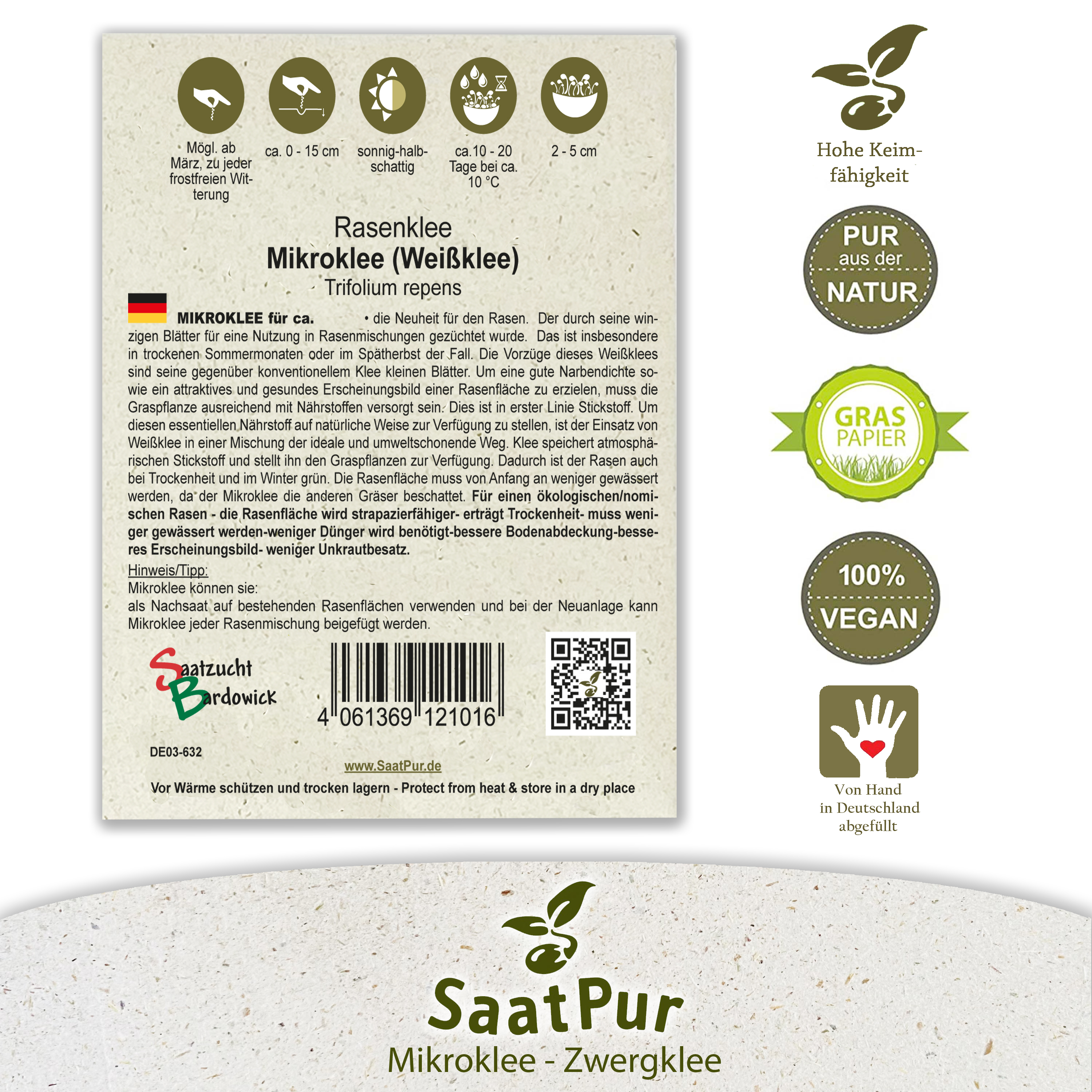 - Spezial-Saat: Diese spezielle Züchtung hat besonders kleine Blätter, was zu einem noch einheitlicheren Erscheinungsbild des Micro Clover Rasen führt
