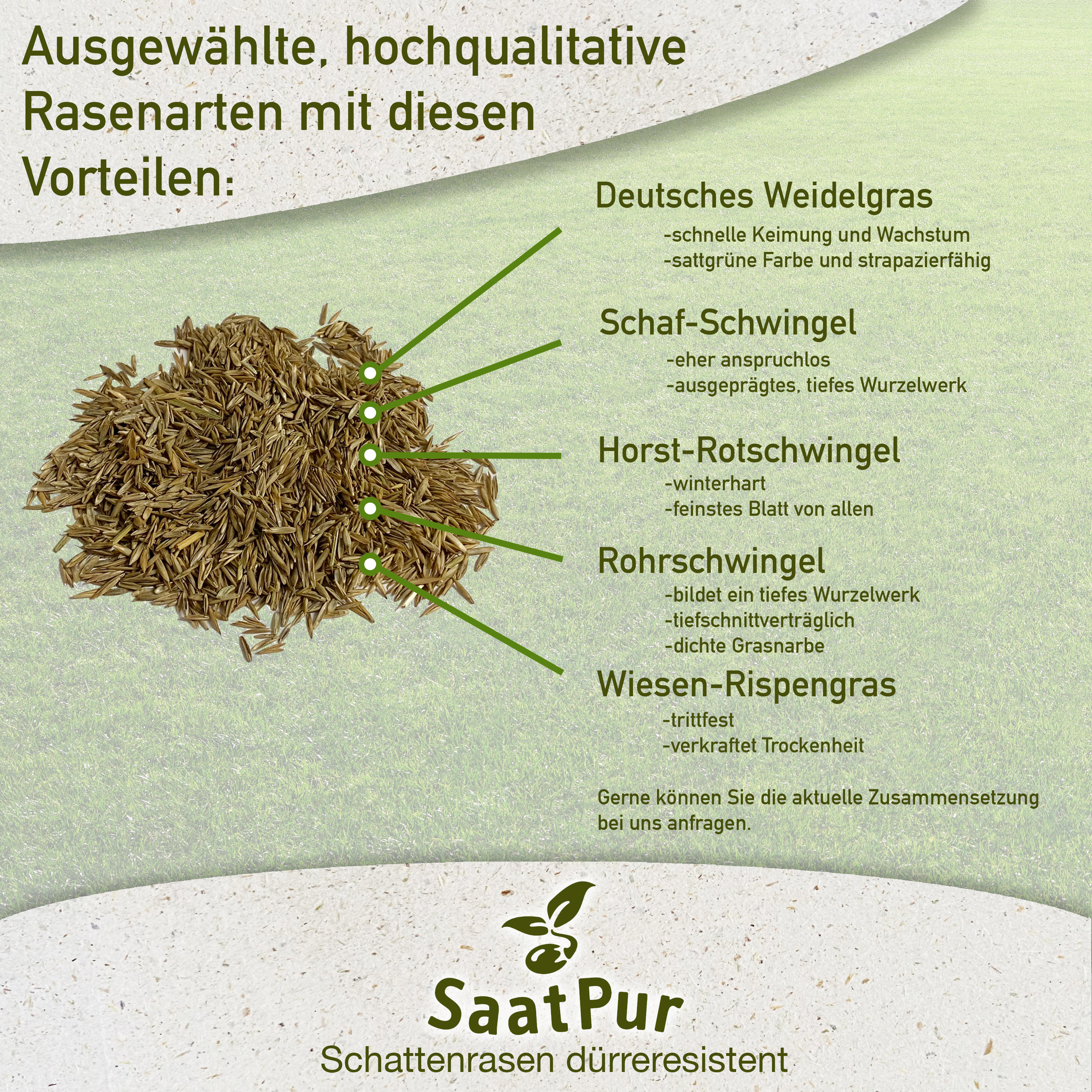 SaatPur® "Sport- und Spielrasen " 2,5 Kg für ca. 75 – 100 m² / (Aussaatmenge 25 – 30g / m²) ✅ IDEALER FAMILIENRASEN: Extra entwickelte Rasenmischung für besonders hoch frequentierte Lagen im Garten. Ideal für strapazierte Lagen im Familien-Garten, auf Spielplätzen, Golfanlagen und Parks. Die Rasensaat ist sehr effizient, keimt schnell und eignet sich perfekt zur Neuanlage und als Nachsaat. Aussaatmenge 25 - 30 g/m² -> 2,5 kg reichen für 75 - 100 m². ✅ SAFTIG SATT GRÜN: Diese Rasenmischung bildet eine satt-grüne saftige Grasnarbe und ist durch ein ausgeprägtes Wurzelsystem besonders strapazierfähig. Eine intensive Pflege ist dadurch nicht notwendig. ✅ SPEZIALMISCHUNG AUS MIND: 5 RASENARTEN: Unsere Spezialmischung besteht immer aus saisonal frischen Rasenarten. Wir verwenden dabei mindestens 5 verschiedene Arten, um die besten Eigenschaften zu verbinden. Andere Anbieter wählen aus Kostengründen häufig nur 3 Arten und verpassen so das optimale Mischungsverhältnis. Uns ist es wichtig, dass Ihr Rasen schnell keimt, satt-grün wird und auch bei Schatten und Dürre ohne intensive Pflege eine Freude für Sie und die ganze Familie ist. Fragen Sie die detaillierte, aktuelle Zusammensetzung gern bei uns an. ✅ MEHRJÄHRIGE SORTEN: Unsere Rasenmischung beinhaltet ausschließlich mehrjährige Rasenarten. Wettbewerber bieten teilweise Mischungen an, die einen erheblichen Anteil an einjährigen Arten enthält, die nur im ersten Jahr schnell grün werden, sich dann aber nicht selbst aussähen. ✅ EINFACH ZU SÄEN: Dieser Schattenrasen lässt sich einfach per Hand aussäen. Sowohl bei kompletter Neuanlage als auch bei Nachsaat einfach zu verwenden. Anwendungsgebiet: Hausgarten, Spielplätze, Campingplatz, Liegewiesen, Campingplatz, etc. Standort: Sonnig- bis HalbschattenUnsere Rasen-Spezialmischung Sport- und Spielrasen benötigt wenig Wasser. Die wassersparende Blattmorphologie ist besonders hitzetolerant und eigenet sich auch für trockene und extrem trockene Böden. Diese Rasenmischung bildet eine satt-grüne Grasnarbe und ist durch ein ausgeprägtes Wurzelsystem besonders strapazierfähig. Eine intensive Pflege ist dadurch nicht notwendig. Ideal zum Begrünen von hoch frequentierten Standorten geeignet! Genießen statt begießen!\nUnsere Spezialmischung besteht immer aus saisonal frischen Rasenarten. Wir verwenden dabei mindestens 5 verschiedene Arten, um die besten Eigenschaften zu verbinden. Andere Anbieter wählen aus Kostengründen häufig nur 3 Arten und verpassen so das optimale Mischungsverhältnis. Uns ist es wichtig, dass Ihr Rasen schnell keimt, satt-grün wird und auch bei Schatten und Dürre ohne intensive Pflege eine Freude für Sie und die ganze Familie ist. Fragen Sie die detaillierte, aktuelle Zusammensetzung gern bei uns an.\nUnsere Rasenmischung beinhaltet ausschließlich mehrjährige Rasenarten. Wettbewerber bieten teilweise Mischungen an, die einen erheblichen Anteil an einjährigen Arten enthält, die nur im ersten Jahr schnell grün werden, sich dann aber nicht selbst aussähen.\nDieser Schattenrasen lässt sich einfach per Hand aussäen. Sowohl bei kompletter Neuanlage als auch bei Nachsaat einfach zu verwenden.\n\nUnsere Zusammensetzung Die aktuelle Zusammensetzung teilen wir Ihnen gerne auf Anfrage mit.\n\nUnser Tipp:\nIst es sehr heiss und trocken sollten Sie den Rasen etwa 5-8 cm lang wachsen lassen. Der Boden erhält somit Schatten durch die Gräser und kann das Wasser im Boden halten, ohne dass es zu schneller Verdunstung an der Oberfläche führt.Die richtige Rasenmischung macht den Unterschied!Die richtige Rasengräser sind entscheidend ob Ihr Rasen viel Wasser benötigt oder nicht. Ein guter Rasen besteht immer aus verschiedenen Rasensorten. Rasenmischungen, die viel Lolium Weidelgräser beinhalten, haben einen hohen Wasserverbrauch, der auch nicht zu senken ist. Achten Sie auf die jeweilig Zusammensetzung. Insofern Sie bereits eine Neuanlage haben und es soll in den nächsten Jahren ein \"Traumrasen\" mit wenig Zeitaufwand, bzw. wenig Wasserbedarf sein, können Sie im Frühjahr nach dem Vertikutieren, diesen Rasen als Nachsaat verwenden und nach und nach somit einen perfekten Rasen, dürreresistent und wassersparend, erhalten.Extra entwickelte Familien-Rasenmischung für schattige und halbschattige Lagen im Garten und trockene Standorte. Ideal für schattige Lagen im Garten, auf Spielplätzen, Golfanlagen und Parks. Die Rasensaat ist sehr effizient, keimt schnell und eignet sich perfekt zur Neuanlage und als Nachsaat. Aussaatmenge 30 - 50 g/m² -> 5 kg reichen für 100 - 150 m².Unsere Rasen-Spezialmischung Sport- und Spielrasen benötigt wenig Wasser. Die wassersparende Blattmorphologie ist besonders hitzetolerant und eignen sich auch für trockene und extrem trockene Böden. Diese Rasenmischung bildet eine satt-grüne Grasnarbe und ist durch ein ausgeprägtes Wurzelsystem besonders strapazierfähig. Eine intensive Pflege ist dadurch nicht notwendig. Ideal zum Begrünen von hoch frequentierten Standorten geeignet! Genießen statt begießen!Unsere Spezialmischung besteht immer aus saisonal frischen Rasenarten. Wir verwenden dabei mindestens 5 verschiedene Arten, um die besten Eigenschaften zu verbinden. Andere Anbieter wählen aus Kostengründen häufig nur 3 Arten und verpassen so das optimale Mischungsverhältnis. Uns ist es wichtig, dass Ihr Rasen schnell keimt, satt-grün wird und auch bei Schatten und Dürre ohne intensive Pflege eine Freude für Sie und die ganze Familie ist. Fragen Sie die detaillierte, aktuelle Zusammensetzung gern bei uns an.Unsere Rasenmischung beinhaltet ausschließlich mehrjährige Rasenarten. Wettbewerber bieten teilweise Mischungen an, die einen erheblichen Anteil an einjährigen Arten enthält, die nur im ersten Jahr schnell grün werden, sich dann aber nicht selbst aussähen.Dieser Schattenrasen lässt sich einfach per Hand aussäen. Sowohl bei kompletter Neuanlage als auch bei Nachsaat einfach zu verwende