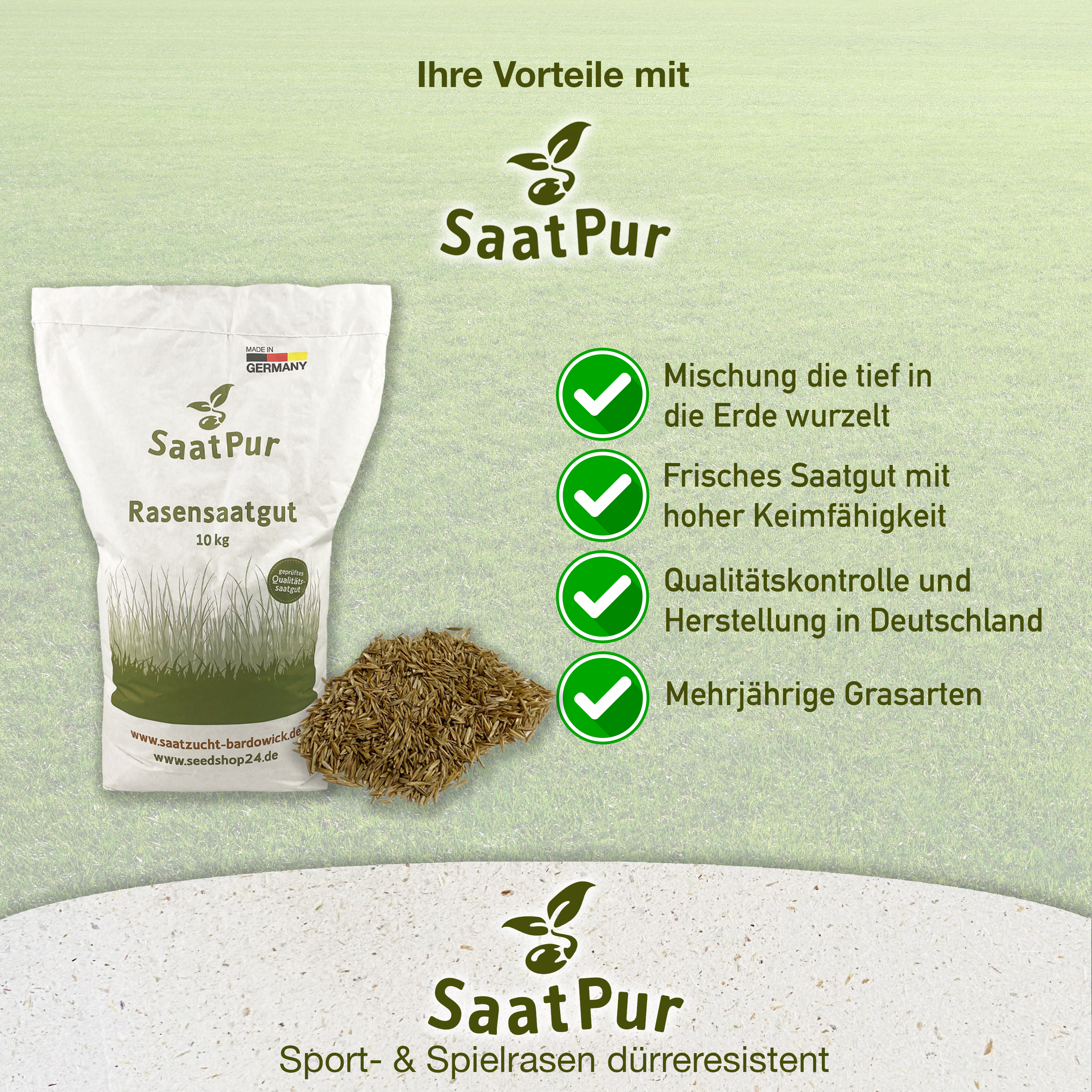10kg Sport und Spielrasen | Rasennachsaat, Gras, Grassamen, Nachsaatrasen Rasen Nachsaat, Rasensaat Made in Germany | Grassamen | ca. 300-400 m² ✅ Qualitäts-RASENMISCHUNG FÜR LANGLEBIGE Rasenflächen: Nehmen Sie die SaatPur 10kg (ca. 300-400 m2) Rasensaat zur Umwandlung ihrer Rasenfläche zum Traumrasen. Aussaatmenge 25 - 30 g/m² ✅ IDEALE GRASSAAT MEN FÜR IHRE GARTENFLÄCHE: zertifizierte Rasengräser für einen grünen, langlebigen, gleichmäßigen Rasen. ✅ RASENMISCHUNG DER EXTRA KLASSE: langjährige Erfahrung in der Züchtung, ausgewählter Grassorten für SaatPur Sport und Spielrasen. ✅ UNKRAUTFREIE RASENSAAT – Durch die speziell ausgewählten Rasengräser mit unterschiedlicher Keim- und Wachstumsverhalten hat Unkraut keine Chance sich in ihrem Rasen auszubreiten. ✅ SaatPur Rasenmischungen – Auch zur Nachsaat können sie diese Mischung verwenden, sogar bestehenden Rasen auffrischen. ✅ SaatPur Sport- und Spielrasen – ist trittfest, pflegleicht und strapazierfähig. Somit für alle Hausgärten, Liegewiesen, Campingplätze u. intensiven Nutzung geeignet. Langjährige Erfahrung und mit der Natur gärtnern ist unser Motto bei SaatPur. Unsere Rasenmischung beinhaltet Poa pratensis L diese Grassorte ist ausdauernd und langlebig gegenüber anderen Gräserarten und ist wichtig als Untergras damit Unkräuter keine Chance haben. Erkundigen sie sich speziell auf die Zusammensetzung der Rasenmischung, damit sie eine Qulitäts Rasenmischung erhalten und ihr Traumrasen nach ihren Wünschen wächst. Unsere Rasenmischungen sind zertifiziert nach Reinheit und Keimfähigkeit, diese ersehen sie an dem grünen Etikett am Produkt. Somit können sie versichert sein, ein kontrolliertes Produkt nur mit Rasensamen zu erhalten. Zusammensetzung:die aktuelle Zusammensetzung teilen wir Ihnen gerne auf Anfrage mit. Wir empfehlen eine Aussaat ab ca. Mitte Mai (nach den Eisheiligen). Die Rasensamen sind frisch und keimfähig (zertifiziertes Saatgut). Eine frühe Aussaat birgt immer das Risiko der Kälte und Frost. Keimfaktor Temperatur: Mindestens 10 °C sollte die Bodentemperatur bei der Einsaat betragen. Optimal für die meisten Rasengräser ist eine Keimtemperatur von 16 bis 23 °C. Keimdauer der Grasarten, bei optimalen Bedingungen: Deutsches Weidelgras (Lolium perenne) 7 bis 15 Tage Rotschwingel (Festuca rubra) 10 bis 18 Tage Rohrschwingel (Festuca arundinacea) 10 bis 18 Tage Schafschwingel (Festuca ovina) 11 bis 19 Tage Straußgräser (Agrostis spp.) 12 bis 20 Tage Wiesenrispe (Poa pratensis) 14 bis 21 Tage Lägerrispe (Poa supina) 14 bis 24 Tage Über diesen Zeitraum muss die Fläche kontinuierlich feucht gehalten und vor Frost geschützt werden. Trocknet der keimende Samen aus, wird die Keimung unterbrochen und der Keimling stirbt ab. Alles aus einer Hand für ihren Rasen von SaatPur! Abgestimmte Produkte für ihren Traumrasen. Nur ein gesunder und kräftiger Rasen schafft es dauerhaft, seinen Gartenbesitzer mit tiefgrüner und dichter Grasdecke ohne Moos und Filz zu erfreuen. Dort, wo der Boden zu sauer oder von schlechter Bodenstruktur ist, kann sich die Rasenpflanze oft nicht optimal entwickeln. Schnell breitet sich so unerwünschtes Moos aus. Durch eine gezielte Frühjahrskur wird der Rasen wieder fit für die neue Gartensaison. SaatPur Gartenkalk oder auf kalkhaltigen Böden den Bodenaktivator zur Bodenverbesserung einsetzen – so wird das Bodenleben aktiviert und der Säurezustand für die feinen Rasenwurzeln optimal eingestellt. Die fehlenden Nährstoffe zur sofortigen und langanhaltenden Versorgung des Rasens sollten Sie mit dem SaatPur Spezial-Rasendünger ausgleichen. Sollte der Rasen stark verfilzt und vermoost aus dem Winter kommen empfiehlt sich der Einsatz von SaatPur Rasendünger Aktiv. Dieser hochwertige Dünger ist angereichert mit speziellen Mikroorganismen, die zusammen mit den Bodenbakterien den abgestorbenen Wurzelfilz in natürliche Pflanzennahrung verwandeln. Ein gesunder Boden braucht organische Substanz, damit der notwendige Humus aufgebaut werden kann. Dieser Humus verbessert die Bodenstruktur, aktiviert das Bodenleben und ist insbesondere verantwortlich für eine Ver- besserung des Wasser- speichervermögens und des Lufthaushaltes im Boden. Warum? Die Nährstofffreisetzung aus organischen Düngern erfolgt durch Mikroorganismen im Boden. Bei feuchter, warmer Witterung sind diese besonders aktiv und genau dann benötigen auch die Rasenpflanzen viele Nährstoffe. Deshalb werden nur so viele Nährstoffe aus organischen Düngern freigesetzt, wie die Pflanzen auch aufnehmen können. Der Anteil an mineralischen Nährstoffen in den SaatPur Rasendüngern sorgt für eine sofortige Nährstoff- bereitstellung für die Rasenpflanzen.